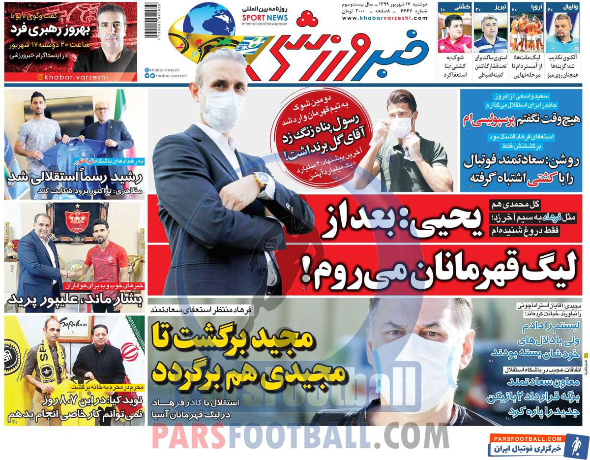 عناوین روزنامه خبر ورزشی دوشنبه ۱۷ شهریور ماه به شرح زیر است :