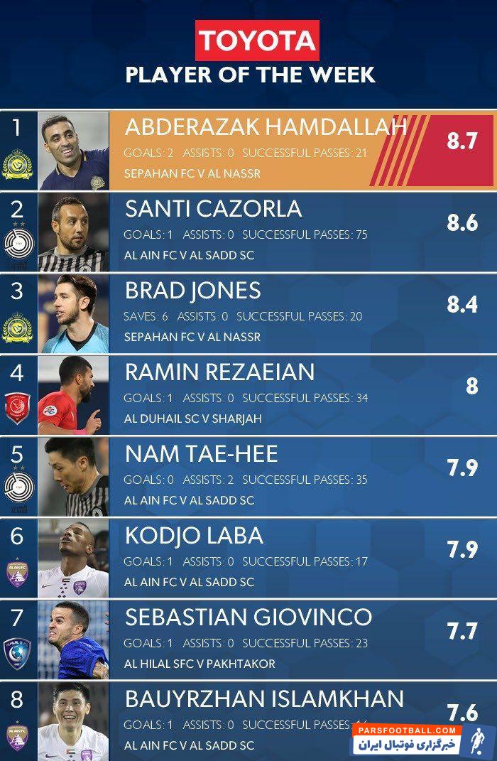 درنهایت باید به حضور جونز گلر استرالیایی النصر در میان بهترین ها اشاره کرد که با ۶ بار نجات دروازه تیمش، توانست سومین بازیکن برتر هفته شود.