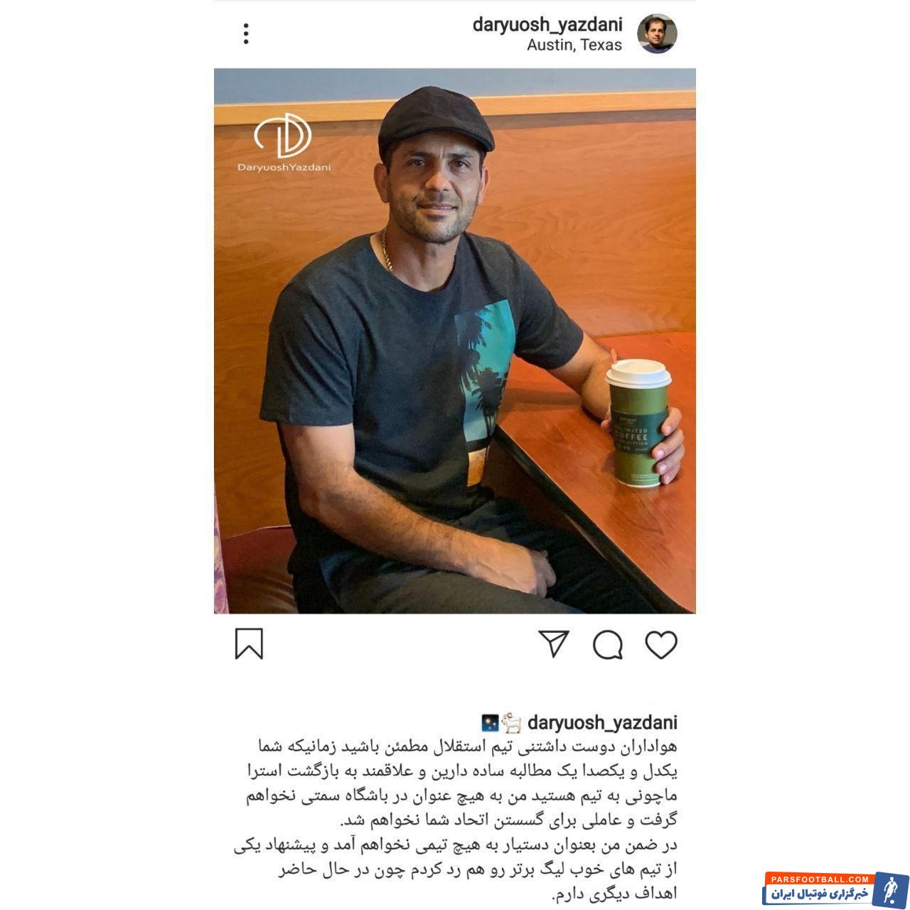 داریوش یزدانی بازیکن پیشین استقلال در پست اینستاگرامی خود نوشت: زمانیکه شما هواداران یک مطالبه دارید و علاقمند به بازگشت استراماچونی هستید، من به هیچ عنوان عاملی برای گسستن اتحاد شما نخواهم شد.