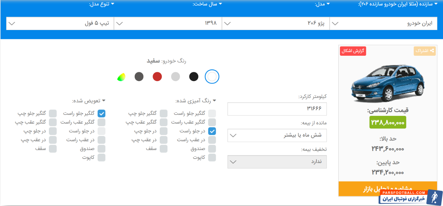پس از تعیین این پارامترها میتوانید قیمت دقیق و کارشناسی یک خودرو را ببینید. سپس باید نقاط رنگ شده یا تعویض شده را مشخص کرده و کیلومتر خودرو را نیز وارد کنید. در نهایت قیمت روز خودرو شما آماده است.