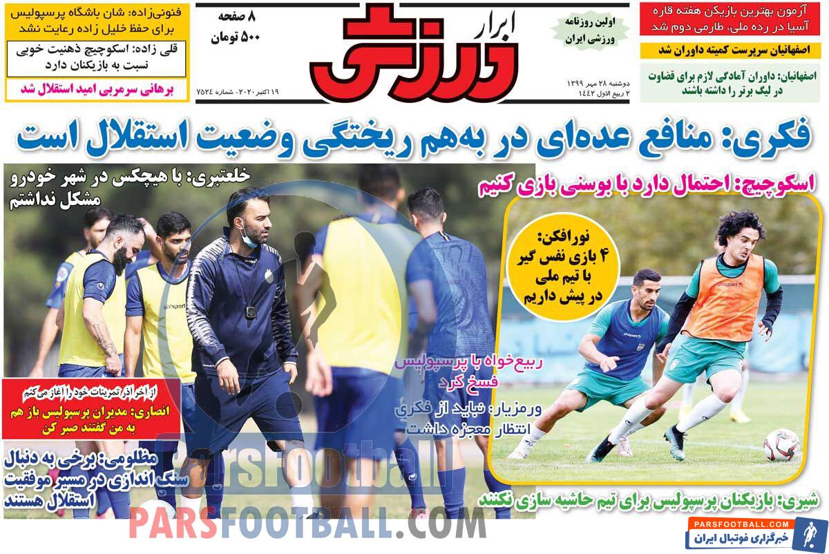 عناوین روزنامه ابرار ورزشی دوشنبه ۲۸ مهر ماه به شرح زیر است :