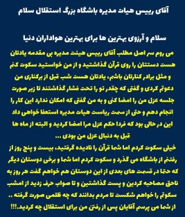 «آقای رئیس هیأت مدیره یادتان هست را دست خود را روی قرآن گذاشتید و از من خواستید سکوت کنم و مانند برادر کنارتان باشم. یادتان هست شب قبل از برکناری من دعوت کردید و گفتید که چقدر تو را تحت فشار گذاشتند که زیر صورتجلسه عزل مرا امضا کنی، و به من گفتی که امکان ندارد این کار را انجام دهم و حتی از سمت ریاست هیأت مدیره استعفا خواهی داد. این در حالی بود که فردا حکم عزل مرا امضا کردید و از البته از ماهها قبل به دنبال عزل من بودی….