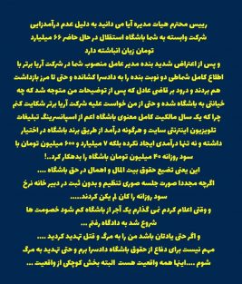 رئیس محترم هیأت مدیره آیا میدانید به دلیل عدم درآمدزایی شرکت وابسته به شما باشگاه استقلال در حال حاضر ۶۶ میلیارد تومان زیان انباشته دارد؟ پس از اعتراض شدید بنده مدیرعامل منصوب شما در شرکت آریا برتر با اطلاع کامل شما، طی دو نوبت بنده را به دادسرا کشانده و حتی تا مرز بازداشت هم بردند و درود بر قاضی عادل که پس از توضیحات من متوجه شد که چه خیانتی به باشگاه شده و حتی از من خواست علیه شرکت آریا برتر شکایت کنم.