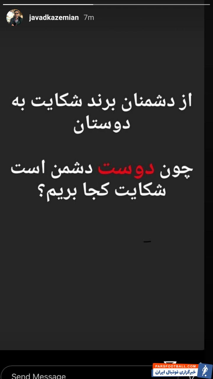 جواد کاظمیان ، پیشکسوت پرسپولیس ،با انتشار پیامی در فضای مجازی به شکل جالبی به بعضی از پرسپولیسی ها کنایه زد و نوشت : از دشمن برند شکایت به دوستان ، چون دوست دشمن است شکایت به کجا برند ؟
