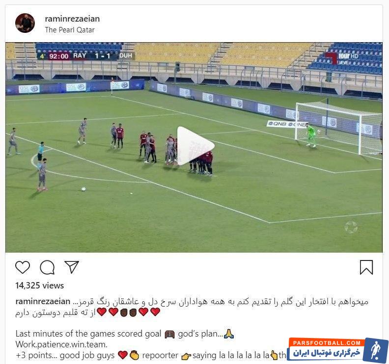 رامین رضاییان حالا کاشته زیبایی که در لیگ قطر به ثمر رساند را در یک پست اینستاگرامی به هواداران پرسپولیس تقدیم میکند.