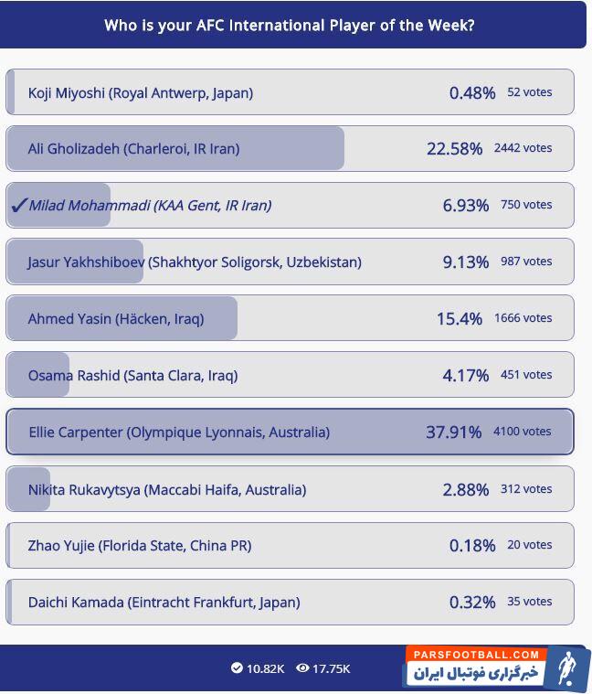 نظرسنجی سایت کنفدراسیون فوتبال آسیا برای انتخاب بهترین لژیونر هفته گذشته قاره کهن امروز (شنبه) به پایان رسید که در نهایت دو بازیکن ایرانی نتوانستند بهترین هفته شوند. در این نظرسنجی الی کارپنتر استرالیایی عضو باشگاه لیون با کسب ۳۷ درصد آراء بهترین لژیونر هفته آسیا شد. علی قلیزاده ، هافبک ایرانی شارلروا با کسب ۲۲ درصد آراء در رده دوم ایستاد. میلاد محمدی مدافع خنت بلژیک هم در این نظرسنجی با کسب ۶ درصد در رده پنجم ایستاد.