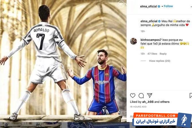 حالا الما، یکی از خواهران رونالدو کاریکاتوری در صفحه اینستاگرامش منتشر کرده که مسی در مقابل برادر وی زانو زده است.