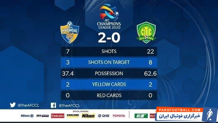 تیم سبزپوش چینی در این بازی ۲۲ شوت زد که ۸ تا در چارچوب بود. در این بین رناتو آگوستو به تنهایی شش بار دروازه اولسان را هدف کرد و ۴ ضربه در چارچوب را ثبت کرد که همه ضربات را سو هوک جو سیو کرد تا در دیداری عجیب، اولسان با وجود آمار ضعیف تر و به دلیل نرخ بهره وری بهتر، بلیت بازی نیمه نهایی لیگ قهرمانان آسیا را کسب کند.