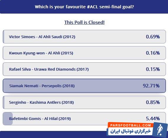 در پایان این گزارش، سایت AFC از کاربرانش خواست تا بهترین گل میان گزینهها را انتخاب کنند که با پایان فرصت شرکت در آن، گل سیامک نعمتی هافبک پرسپولیس با کسب ۹۲.۷۱ درصد آرا، در رتبه نخست این نظرسنجی قرار گرفت.
