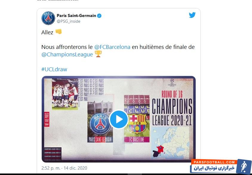 حساب توئیتر باشگاه پی اس جی به قرعه امروز یک هشتم نهایی لیگ قهرمانان و برخورد با بارسا واکنش نشان داد.