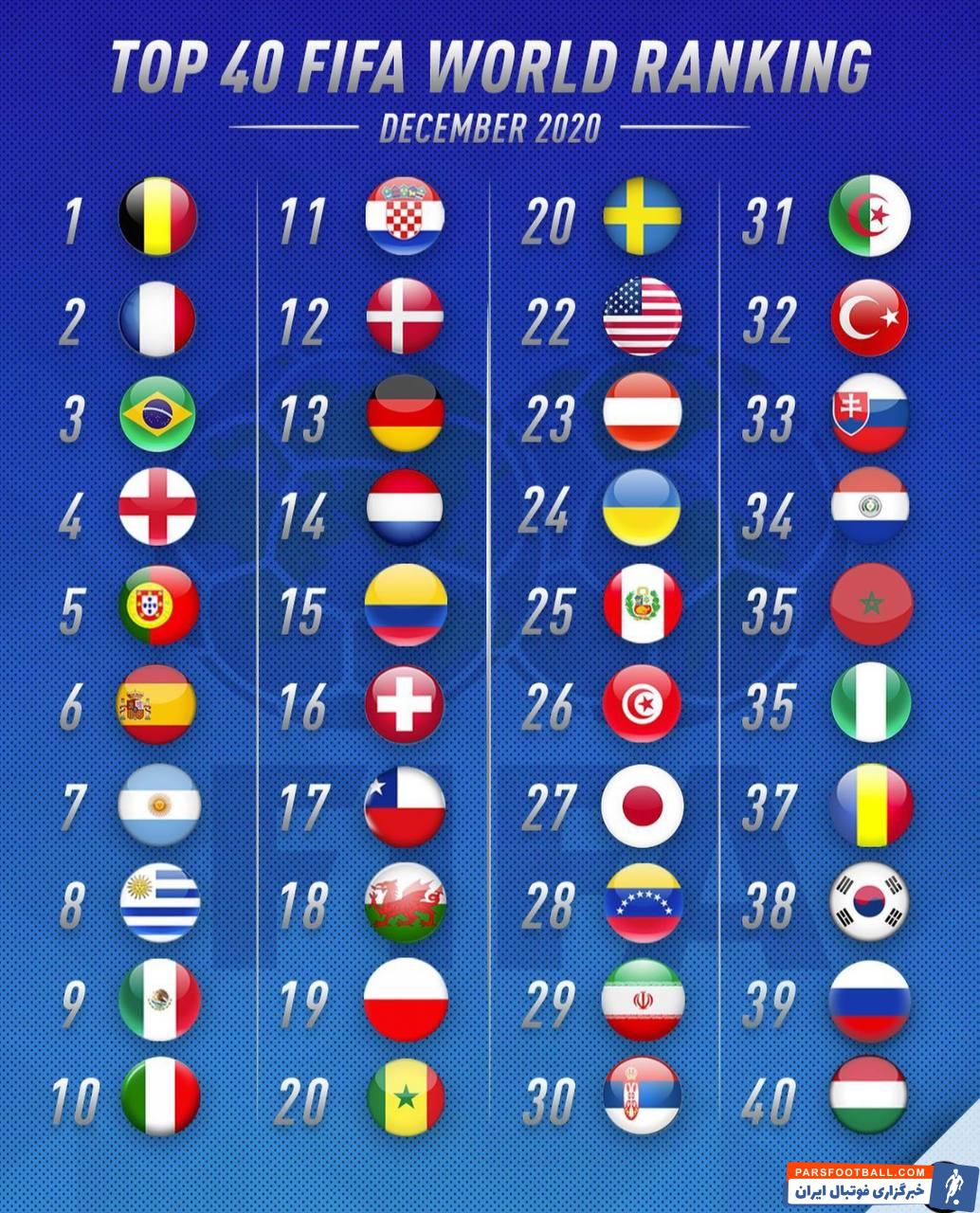 تیم های بلژیک ، فرانسه ، برزیل ، انگلیس و پرتغال تیم های اول تا پنجم رده بندی بهترین تیم های ملی جهان هستند .
