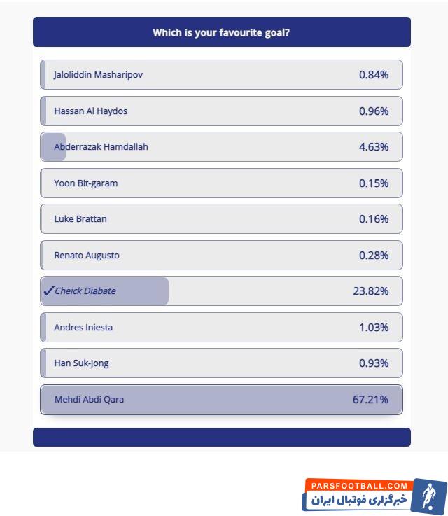 کنفدراسیون فوتبال آسیا هفته گذشته یک نظرسنجی برگزار کرد تا بهترین گل لیگ قهرمانان آسیا ۲۰۲۰ را با آرا کاربرانش انتخاب کند. گل مهدی عبدی مهاجم پرسپولیس به النصر در نیمه نهایی و گل شیخ دیاباته، مهاجم استقلال مقابل الاهلی عربستان نامزد بودند که در نهایت گل عبدی با کسب ۶۷ درصد آراء بهترین گل این بخش از نظرسنجی انتخاب شد تا به فینال بهترین گل لیگ قهرمانان آسیا ۲۰۲۰ راه پیدا کند. گل دیاباته هم ۲۳ درصد آرا در رده دوم ایستاد.