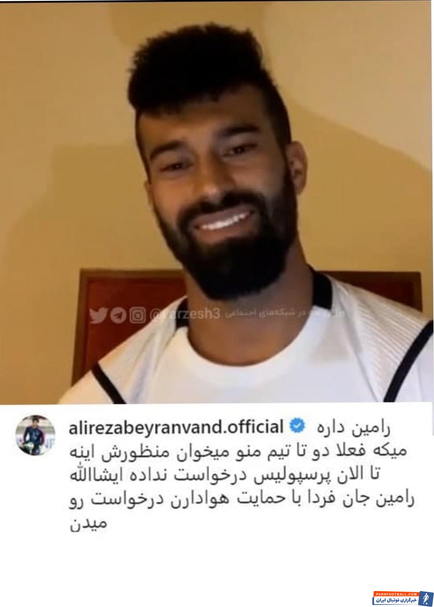 علیرضا بیرانوند در لایو رامین رضاییان : " رامین داره میگه پرسپولیس باید نامه رسمی بزنه تا رامین رو قرضی بگیره "