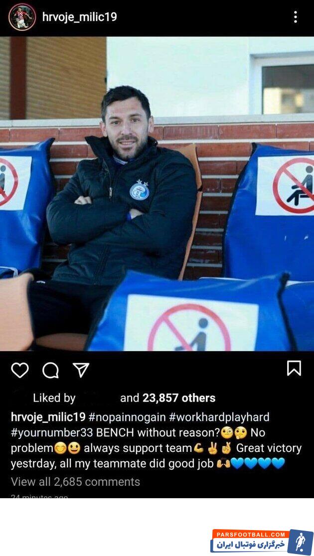 هرویه میلیچ بازیکن استقلال که در برابر گل گهر نیمکت‌نشین بود با انتشار پستی کنایه‌آمیز به این موضوع اعتراض کرد.