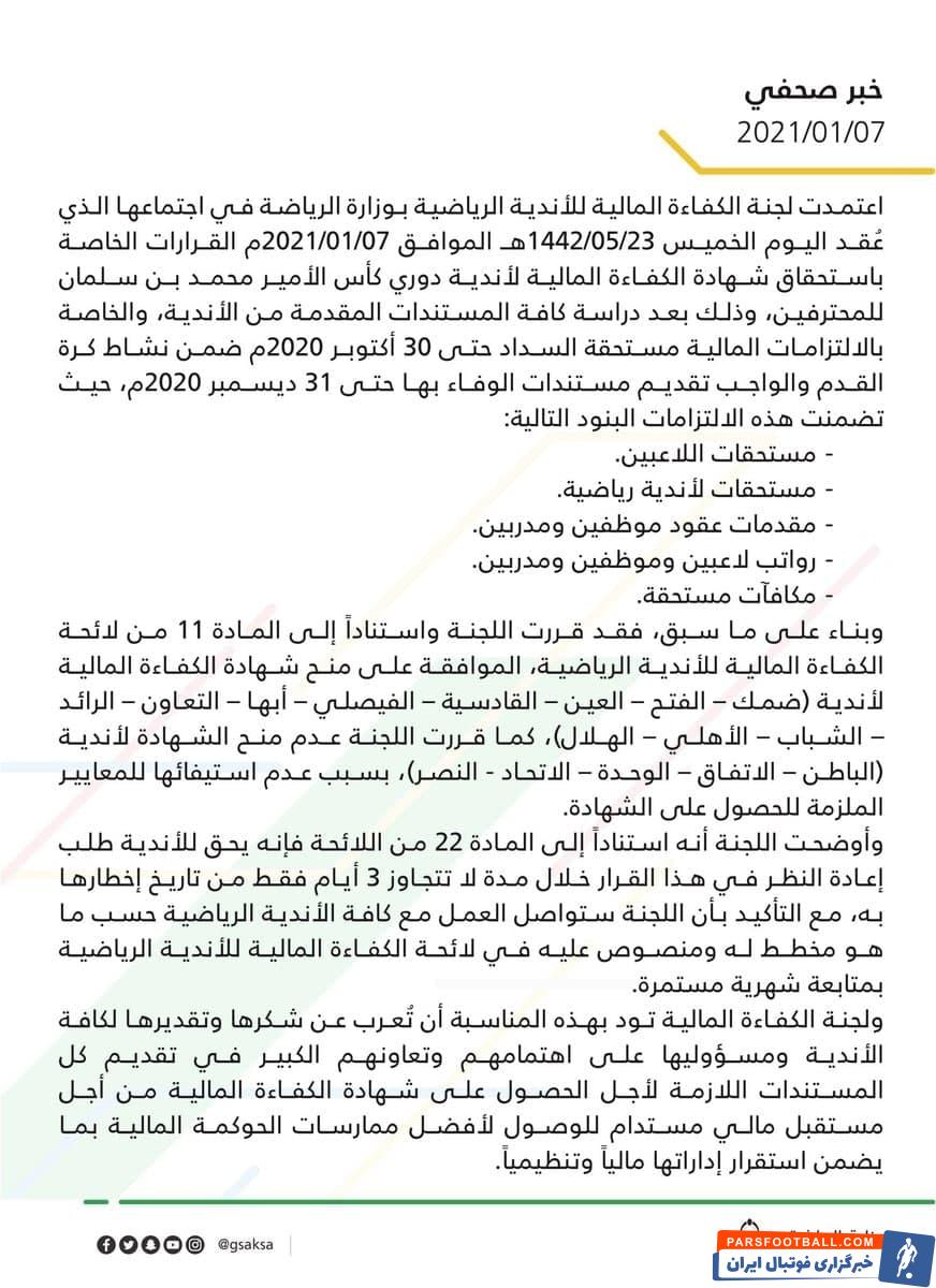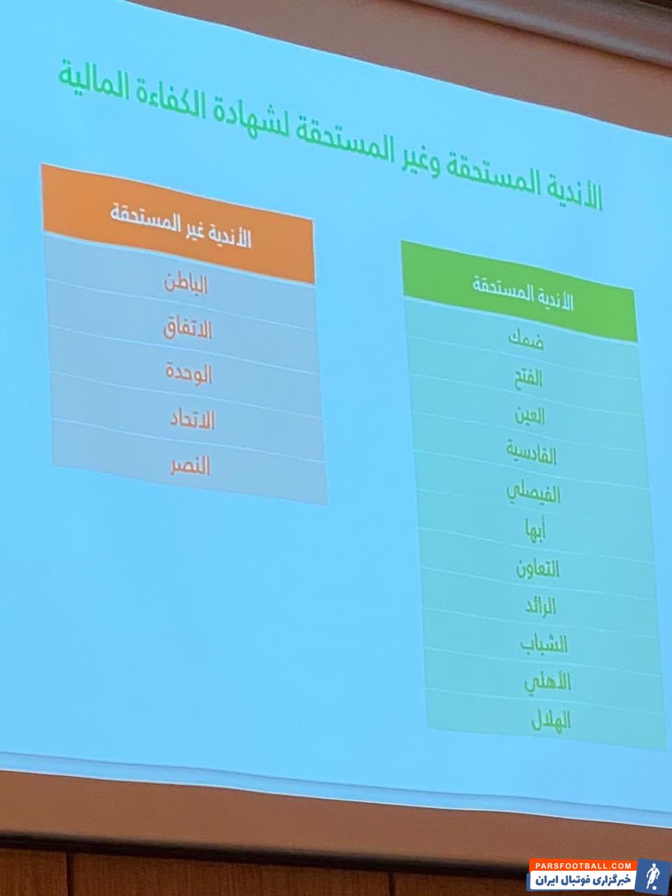 در این نشست فدراسیون فوتبال عربستان با بررسی تراز مالی باشگاهها، نام پنج تیم را به عنوان باشگاههایی که گواهی کفایت مالی را به دست نیاوردهاند، اعلام نکرد؛ این باشگاهها شامل النصر نایب قهرمان غرب آسیا، الاتحاد، الاتفاق، الوحده و الباطن هستند. پنج باشگاهی که با نظر فدراسیون فوتبال عربستان از نقل و انتقالات زمستانی محروم خواهند بود و این مشکل دیگری برای النصر خواهد بود که پس از شکست مقابل پرسپولس همچنان با مشکلات عدیدهای دست و پنجه نرم میکند.