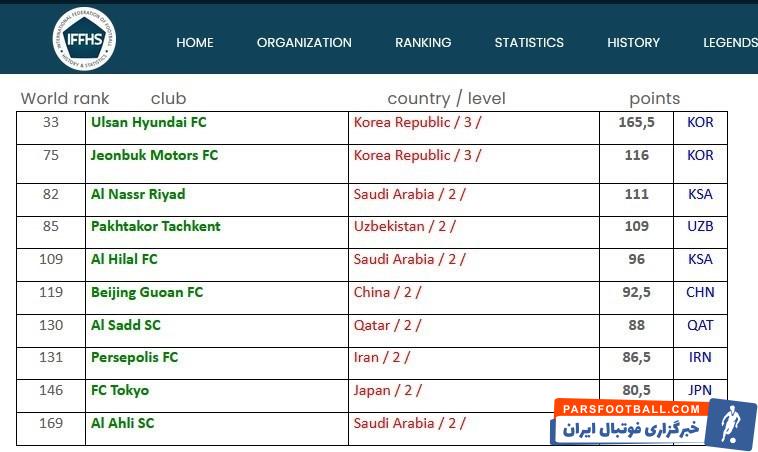 فدراسیون بین المللی آمار و تاریخ فوتبال : پرسپولیس هشتمین تیم برتر قاره آسیا