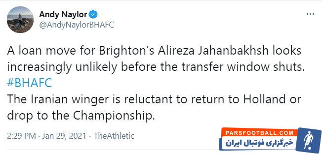 عملکرد نه چندان مطلوب علیرضا جهانبخش در برایتون ، شایعات بازگشت وی به فوتبال هلند را تقویت می کند. درخشش جهانبخش در فوتبال هلند و کسب عنوان آقای گلی اریدیویسه نوید ظهور لژیونری موفق در سطح اول اروپا را می داد ، اما تاکنون اینگونه نشده است. حالا اندی نیلور ، خبرنگار انگلیسی مدعی شده است جهانبخش در برایتون می ماند.