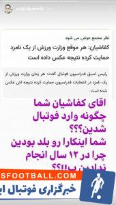 علی کریمی در واکنش به جدیدترین صحبت های علی وفاشیان یک استوری را منتشر کرد و نوشت : آقای کفاشیان شما چگونه وارد فوتبال شدین؟ شما این کارا رو بلد بودین چرا در ۱۲ سال انجام ندادین پس؟