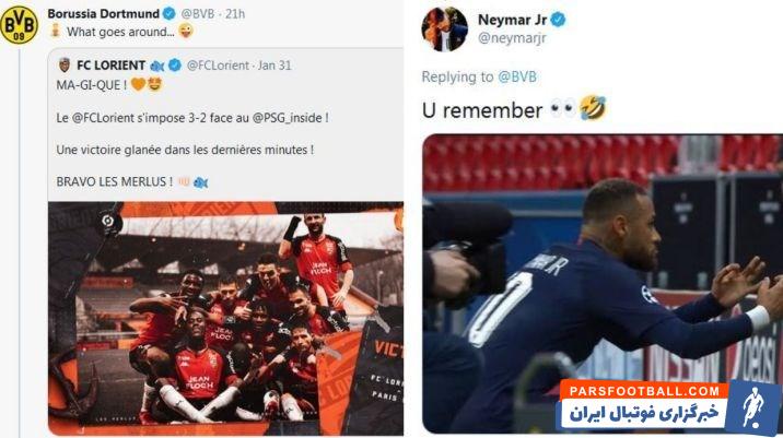 پس از اینکه باشگاه دورتموند در توئیتر پیام طعنه آمیز صفحه رسمی باشگاه لوریان را بازنشر داد، نیمار پاسخ آن را با انتشار عکسی از شادی گلش مقابل دورتموند، داد.