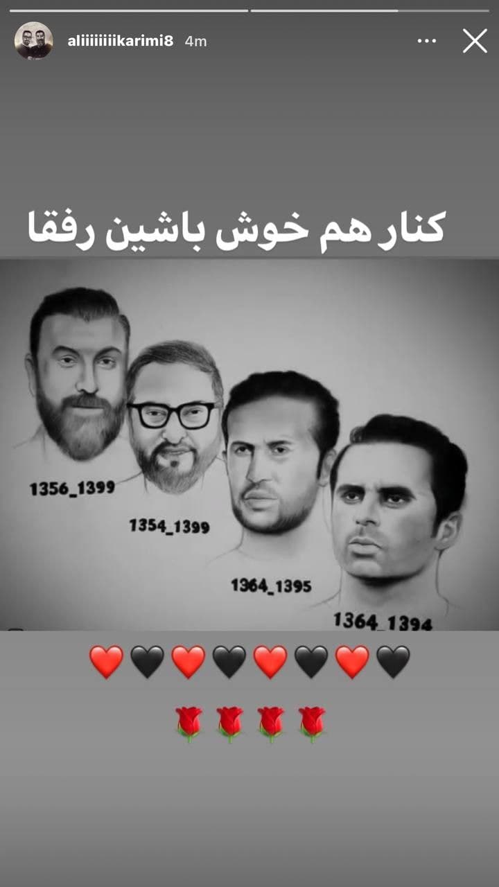کریمی دقایقی پیش با انتشار استوری مربوط به حضور هادی نوروزی، مهرداد اولادی، مهرداد میناوند و علی انصاریان که با همگی آنها سابقه همبازی بودن را داشته، برای آنها طلب آمرزش داشته و اینچنین نوشته: