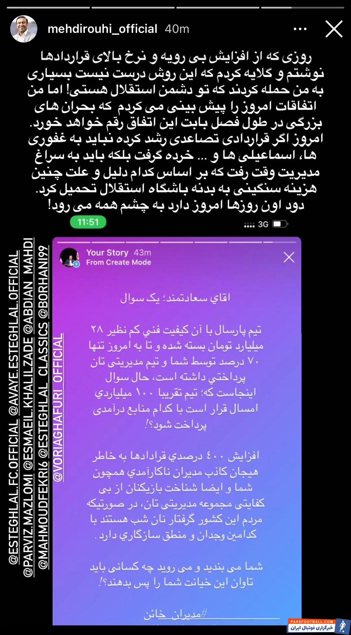 مهدی روحی مدتها قبل در استوری اینستاگرامش به این نکته اشاره کرد که هزینه استقلال برای فصل قبل و زمانی که استراماچونی سرمربی این تیم بود و تیمی که امیرحسین فتحی مدیرعامل وقت و علی خطیر معاون وقت باشگاه استقلال بسته بودند، ۲۸ میلیارد تومان بود اما سعادتمند برای فصل جدید بالای ۱۰۰ میلیارد تومان در فصل نقل و انتقالات تعهد ایجاد کرده که معلوم نیست منابع مالی برای تامین این پول از کجا تامین خواهد شد. اتفاقی که حالا مدیران استقلال را شدیدا به دردسر انداخته و آنها باید پول قراردادهایی را پرداخت کنند که نقشی در بسته شدن آن نداشتند. روحی طوری استوری گذاشته که انگار کار سعادتمند در استقلال به نوعی بمب گذاری برای مدیران بعدی بوده است.