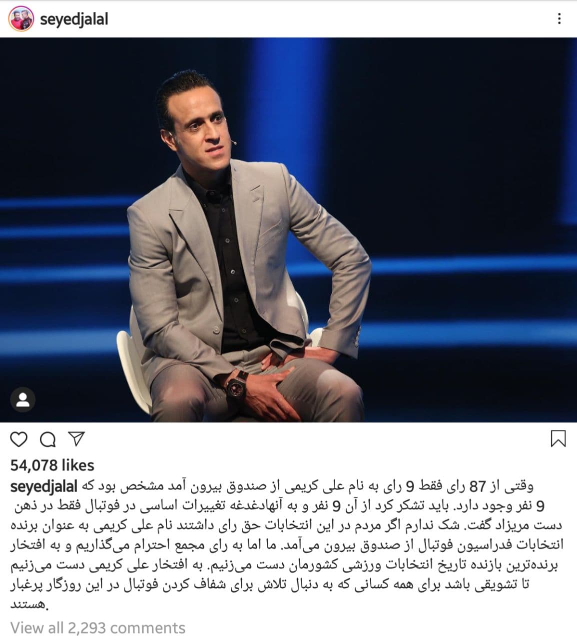 سیدجلال حسینی با انتشار متنی در صفحه اینستاگرامش به نتیجه انتخابات ریاست فدراسیون فوتبال واکنش نشان داد.