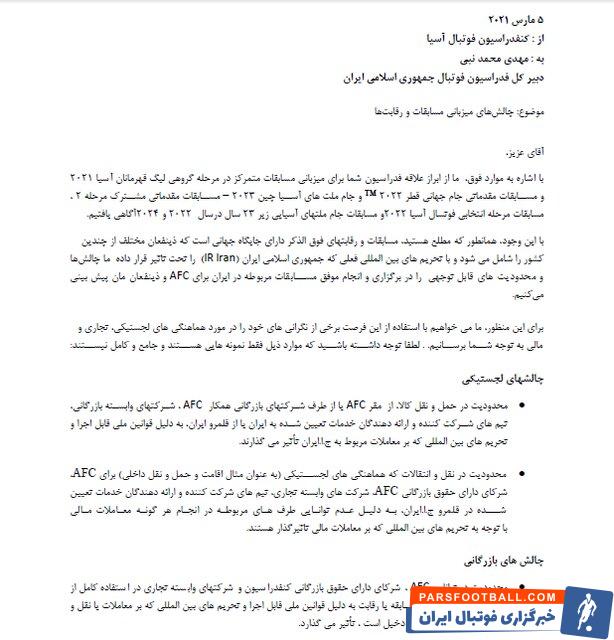 کنفدراسیون فوتبال آسیا AFC با ارسال نامه ای رسمی به فدراسیون فوتبال ایران دلایل اصلی سلب میزبانی از ایران در لیگ قهرمانان آسیا و مقدماتی جام جهانی را اعلام کرد که در آن به وجود چالش های لجستیکی، بازرگانی و مالی اشاره شده است.