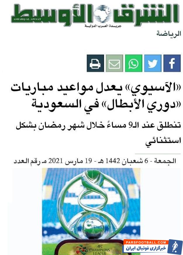 ادعای روزنامه الشرق الاوسط عربستان مبنی بر موافقت AFC با درخواست عربستان برای ساعت برگزاری دیدارهای لیگ قهرمانان آسیا