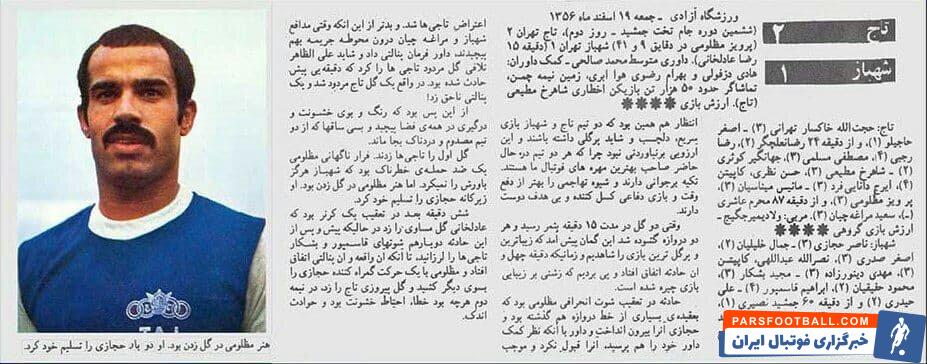 در روز ۱۶ اسفند سال ۱۳۵۶ ، پرویز مظلومی در تیم تاج دو گل به ناصر حجازی در شهبا زد و تاج این بازی را با نتیجه دو بر یک شهبا را شکست داد.
