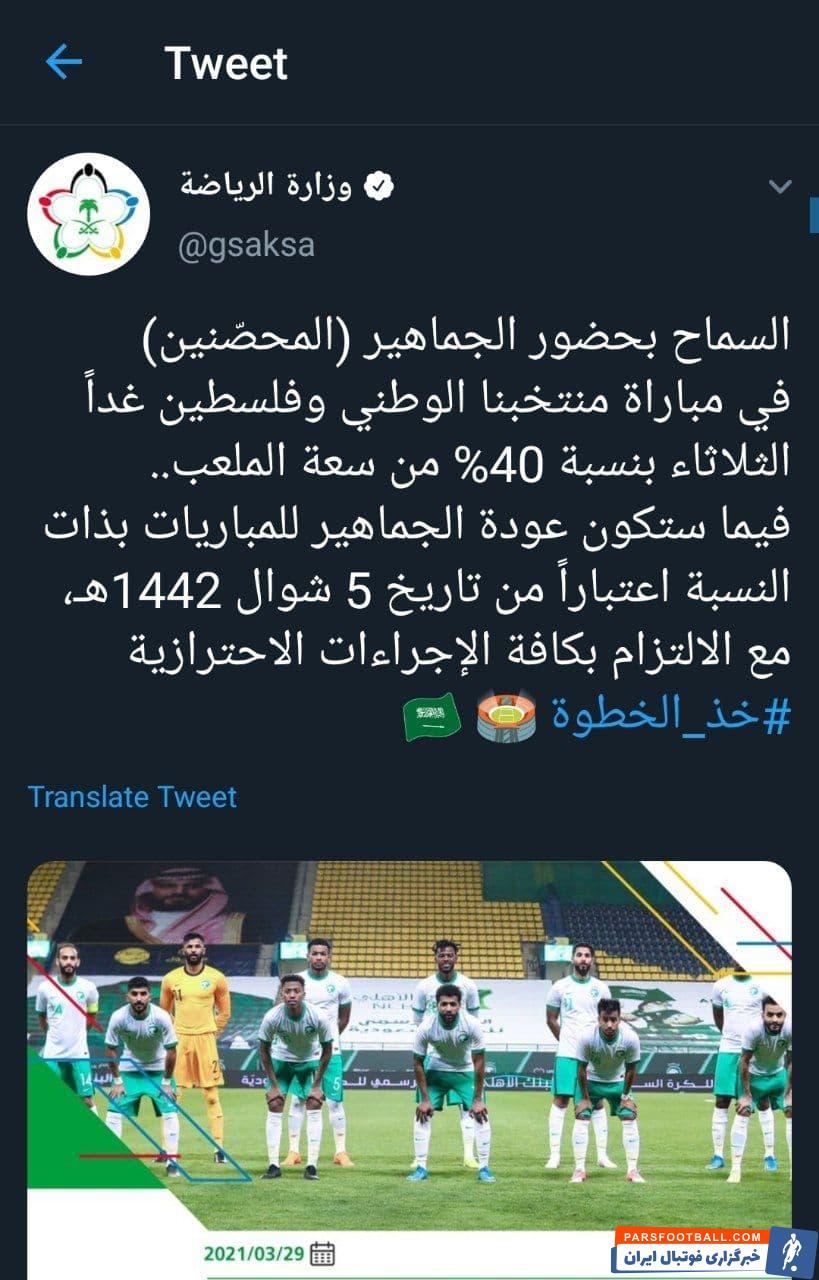 به گزارش پارس فوتبال، وزارت ورزش عربستان طی اطلاعیه ای اعلام کرد که تماشاگران سعودی می توانند فردا و برای تماشای دیدار دوستانه مقابل فلسطین به استادیوم بازگردند البته به شرط اینکه حداکثر تنها ۴۰ درصد از ظرفیت ورزشگاه محل برگزاری این دیدار تکمیل شود.