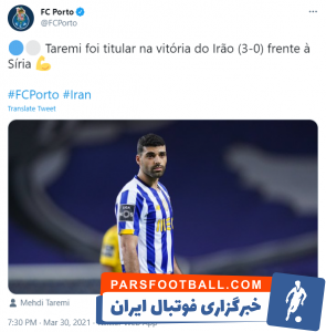 باشگاه پورتو در پستی از عملکرد طارمی در دیدار مقابل سوریه صحبت کرد و نوشت مهدی در ترکیب اصلی ایران در پیروزی ۳ بر صفر قرار گرفت.