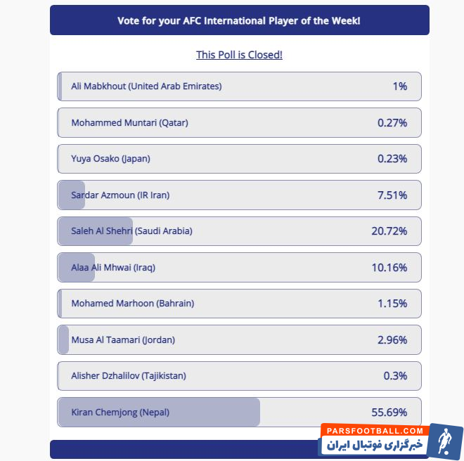 کیران چمجونگ بازیکن تیم ملی نپال در این نظرسنجی با کسب ۵۵ درصد آراء به عنوان بهترین بازیکن هفته آسیا در رده ملی انتخاب شد.