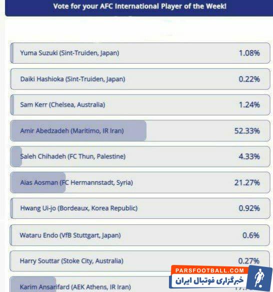 در نظرسنجی این هفته کنفدراسیون فوتبال آسیا برای انتخاب بهترین لژیونر هفته امیر عابدزاده و کریم انصاری فرد دو لژیونر پرسپولیس ایران نیز حضور داشتند.
