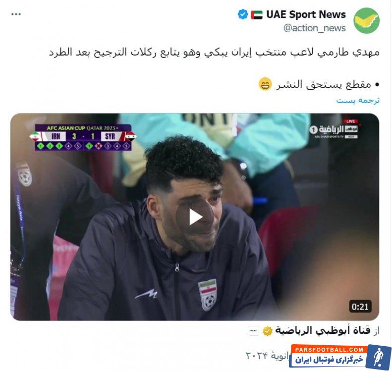 صفحه توئیتری امارات اسپورت با انتشار ویدیویی از اشک ریختن طارمی و ارسال یک ایموجی خنده، نوشت: