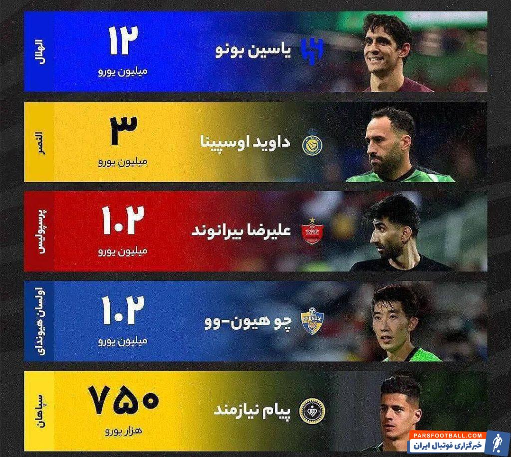 گفتنی است در فوتبال آسیا در حال حاضر یاسین بونو مراکشی با ۱۲ میلیون یورو گران‌ترین دروازه‌بان فوتبال آسیا است و سپس داوید اوسپینا سنگربان پیشین آرسنال قرار دارد.