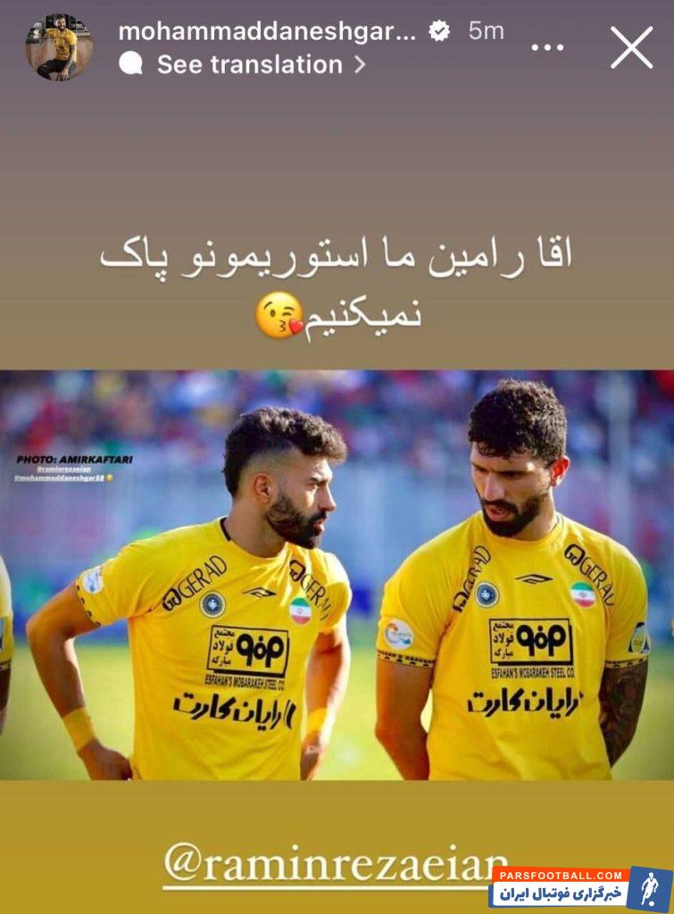 رامین رضاییان ، مدافع تیم سپاهان شب گذشته با انتشار تصویری از محمد دانشگر، از او در مقابل شکایت باشگاه پرسپولیس حمایت کرد. رضاییان پس از واکنش پرسپولیسیها، مجبور به پاک کردن استوری خود شد و حالا این موضوع واکنش مدافع سپاهان را به دنبال داشته است. دانشگر با کنایه به رامین رضاییان در صفحه اینستاگرام خود نوشت: