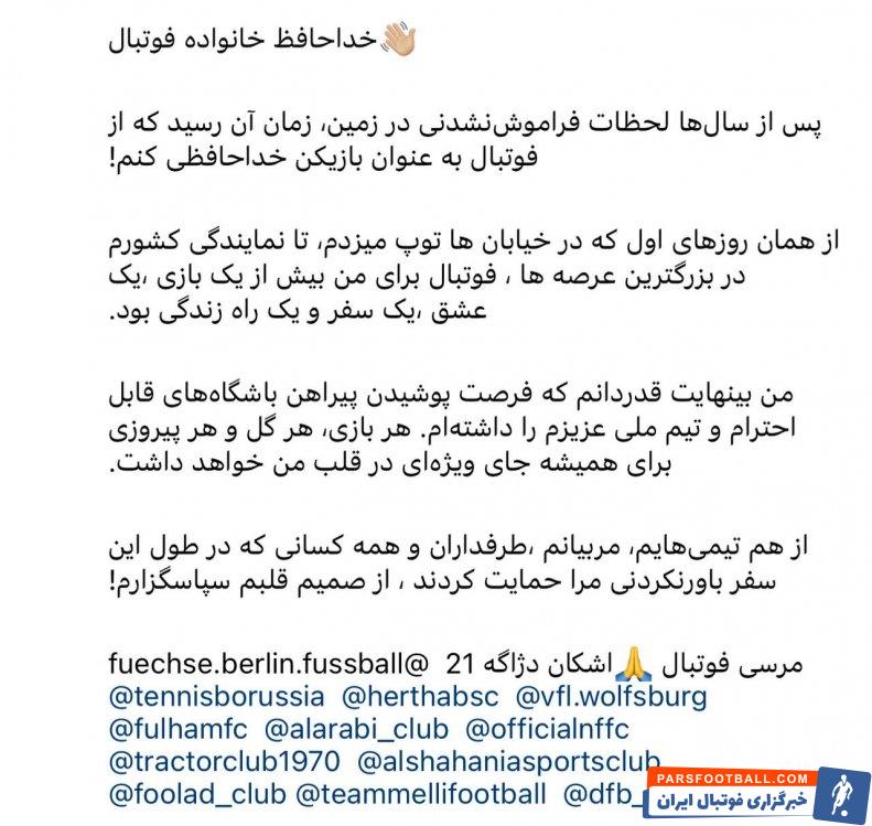 اشکان دژاگه هافبک تهاجمی و وینگر سالهای نه چندان دور تیمهای ولفسبورگ، فولام، ناتینگهام فارست و… که برای دوره طولانی در تیم ملی ایران بازی کرد، با انتشار پستی در اینستاگرام از فوتبال خداحافظی کرد.