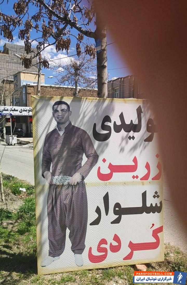 بنر نصب شده از رونالدو با شلوار کُردی در قلعه حسنخان