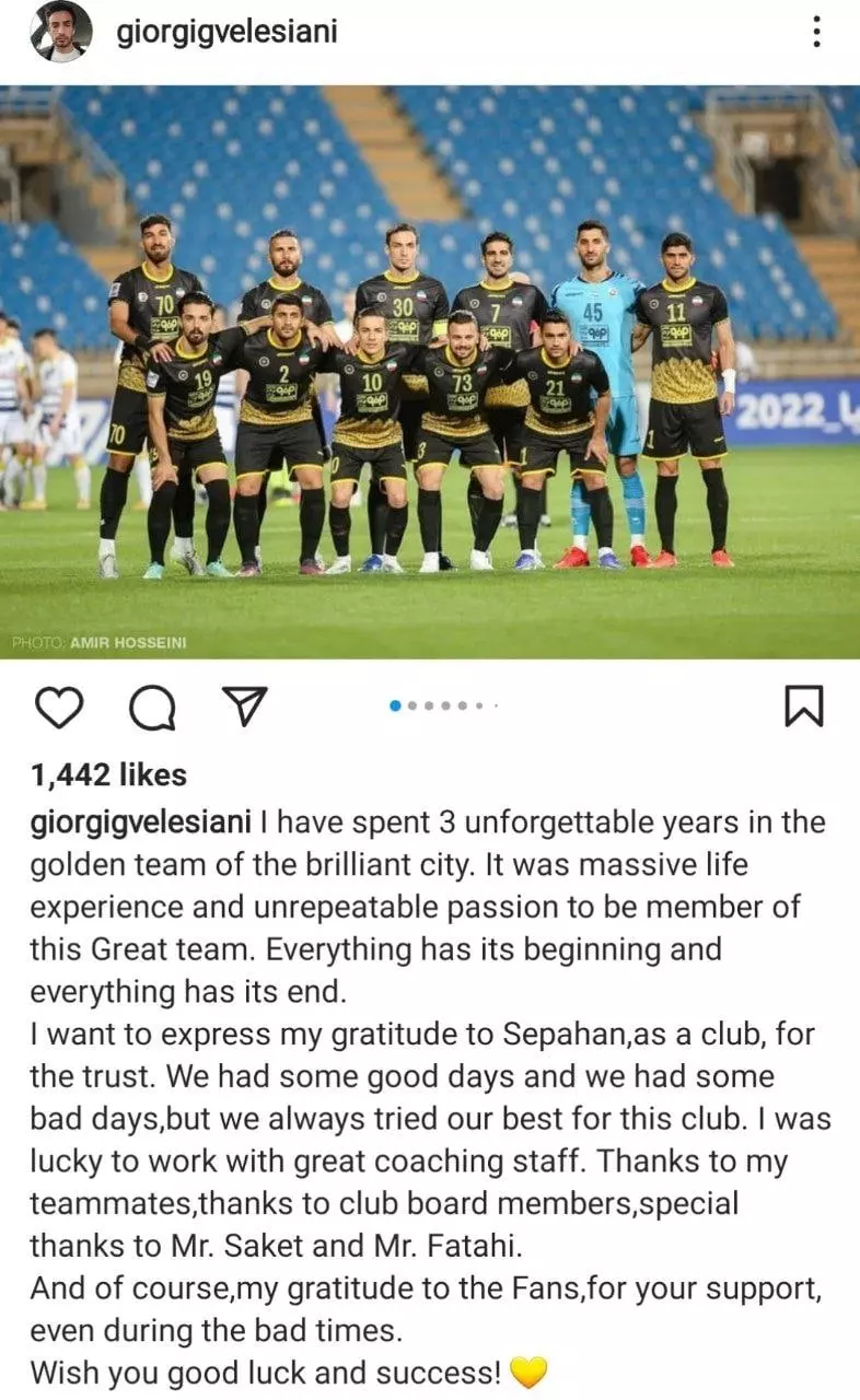 این بازیکن ساعاتی پس از انتشار رسمی خبر پیوستنش به پرسپولیس که توسط ورزش سه منتشر شده و البته هنوز به صورت رسمی توسط باشگاه اعلام نشده است، با انتشار پستی به شرح زیر ضمن تشکر از سپاهانیها با آنها خداحافظی کرده است.