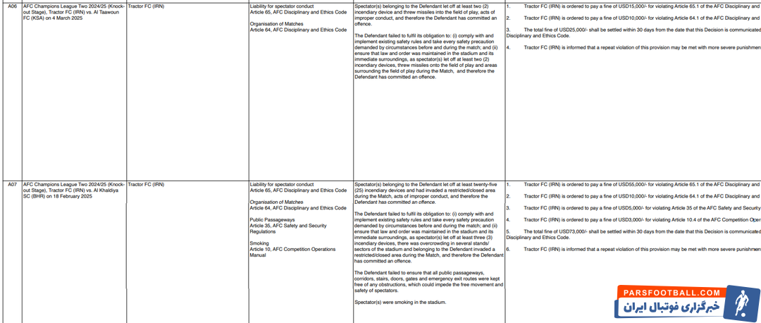 تراکتور به دلیل تخلف پرتاب اشیا آتش زا در بازی با الخالدیه ۵۵ هزار دلار جریمه نقدی شد.
