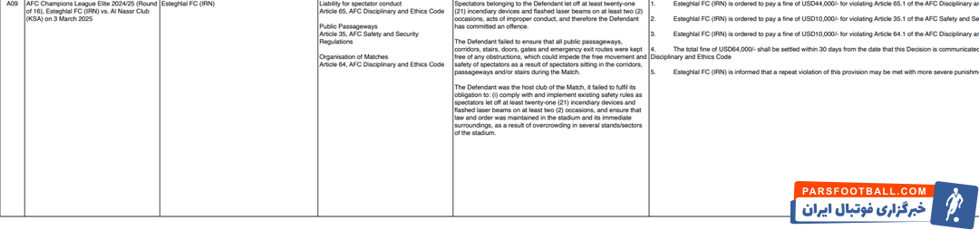 استقلال در مجموع به پرداخت ۶۴ هزار دلار جریمه نقدی محکوم شد.