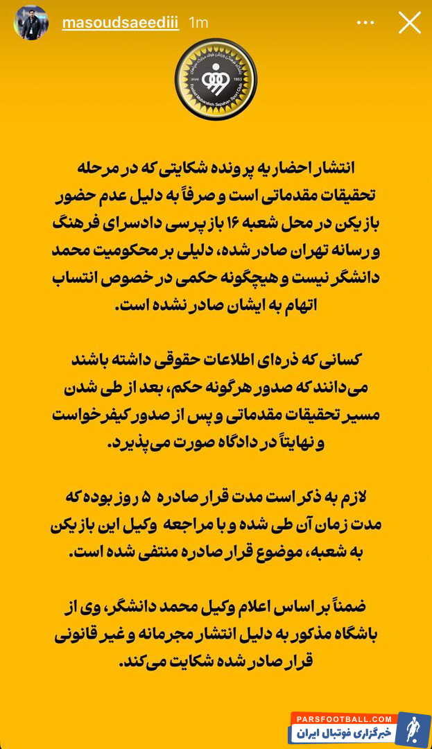 پس از انتشار خبر حکم جلب محمد دانشگر از سوی پرسپولیس، مسعود سعیدی، مدیر رسانه سپاهان با انتشار یک استوری اینستاگرامی به این خبر واکنش نشان داد و گفت: