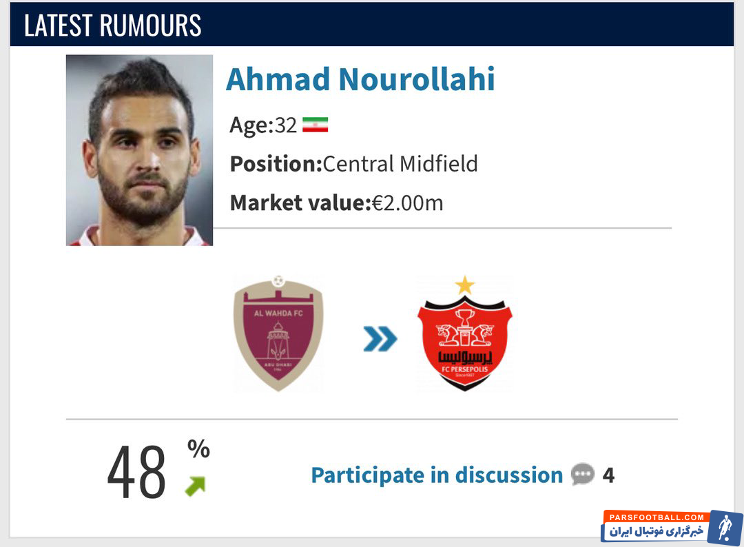 درصد انتقال نوراللهی به پرسپولیس در جدیدترین بروزرسانی ترانسفرمارکت از ۴۸ درصد به ۳۸ درصد کاهش یافت.