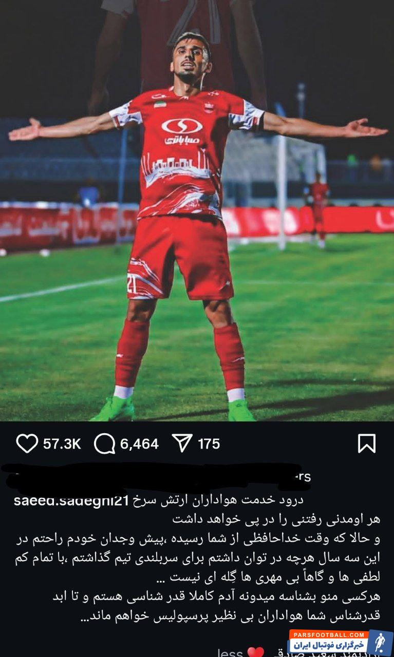 «درود خدمت هواداران ارتش سرخ. هر اومدنی رفتنی را در پی خواهد داشت و حالا که وقت خداحافظی از شما رسیده، پیش وجدان خودم راحتم. در این سه سال هرچه در توان داشتم برای سربلندی تیم گذاشتم. با تمام کملطفیها و گاهاً بیمهریها گِلهای نیست… هرکسی منو بشناسه میدونه آدم کاملا قدرشناسی هستم و تا ابد قدرشناس شما هواداران بینظیر پرسپولیس خواهم ماند… ارادتمند سعید صادقی»