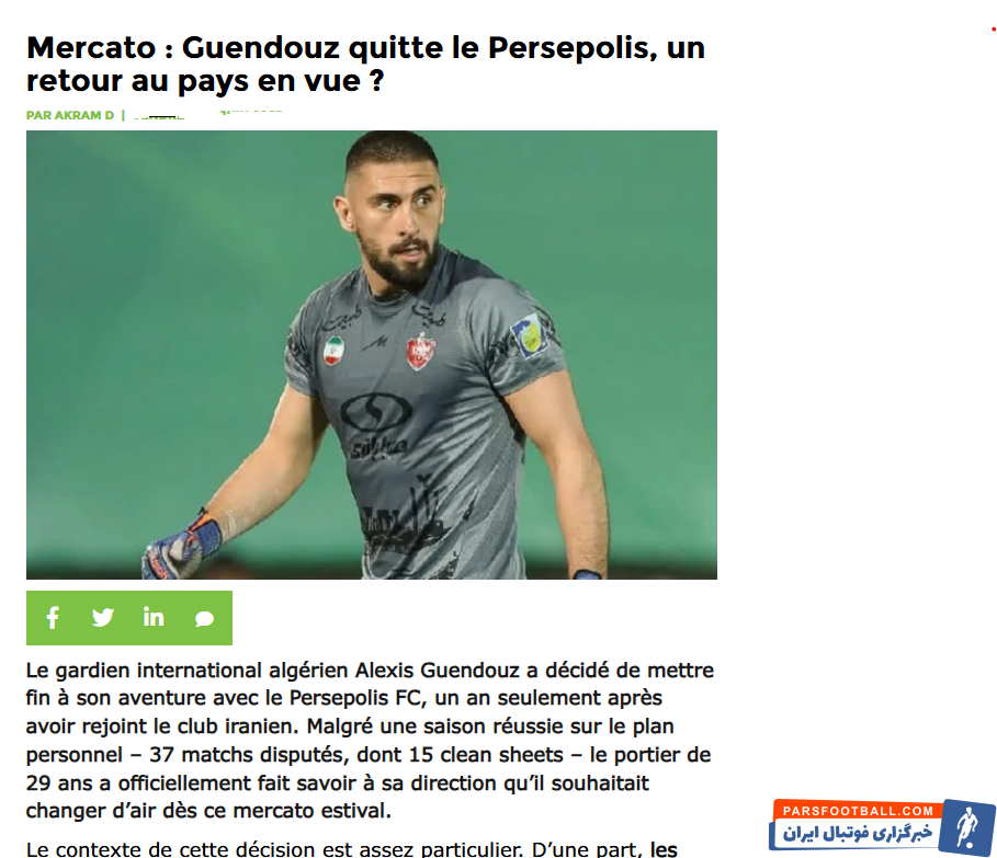 سایت dzfoot الجزایر امروز (یکشنبه) از تصمیم الکسیس گوندوز، دروازه این کشور برای جدایی از پرسپولیس خبر داد.