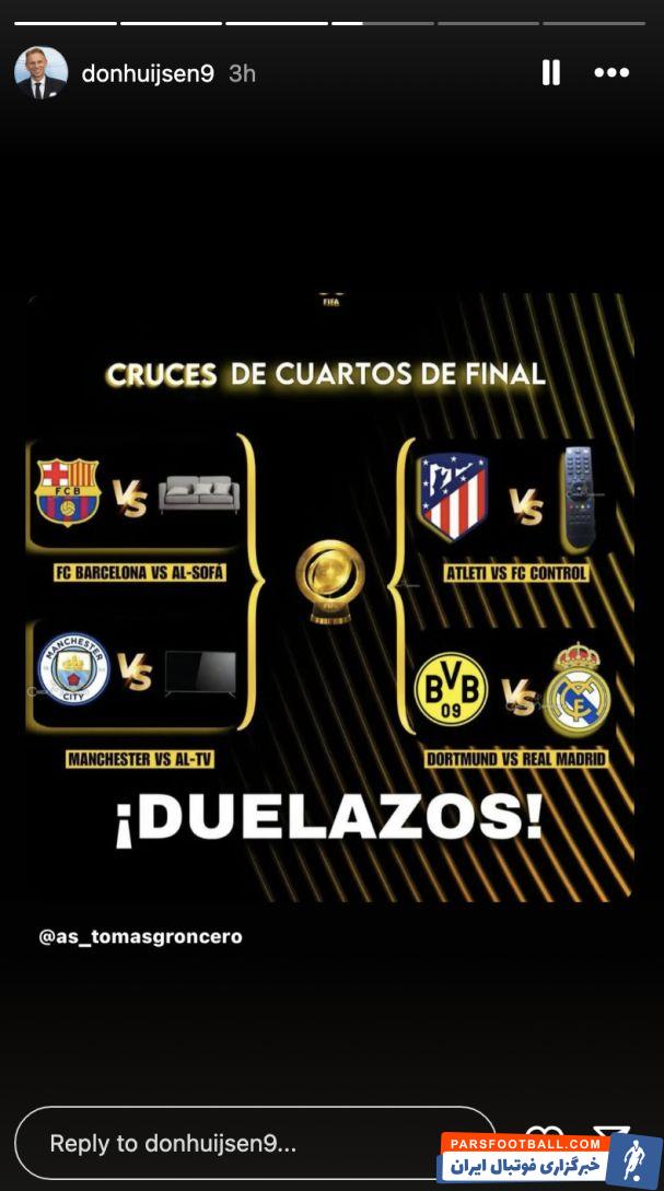 او تصویری تمسخرآمیز از جدول خیالی مرحله یکچهارم نهایی جام جهانی باشگاهها را بازنشر کرد؛ جدولی که در آن تیمهایی مثل بارسلونا، اتلتیکو مادرید و منچسترسیتی نه در زمین مسابقه، بلکه مقابل تلویزیون، مبل و ریموت کنترل قرار گرفتهاند!