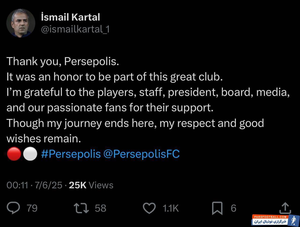 اسماعیل کارتال سرمربی پیشین پرسپولیس گفت : پرسپولیس متشکرم. افتخاری بود که عضوی از این باشگاه بزرگ بودم. از بازیکنان، کارمندان، رئیس، هیئت مدیره، رسانهها و هواداران پرشور تیم به خاطر حمایتی که داشتند سپاسگزارم. همیشه احترام و آرزوهای خوب من برای پرسپولیس پابرجاست.