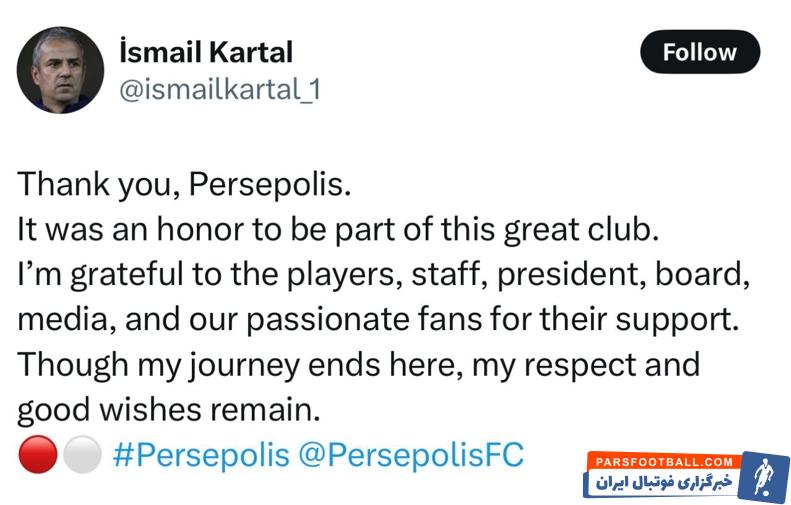 اسماعیل کارتال با انتشار متنی در صفحه ایکس: ممنون، پرسپولیس، برای من افتخاری بود تا عضوی از این باشگاه بزرگ باشم