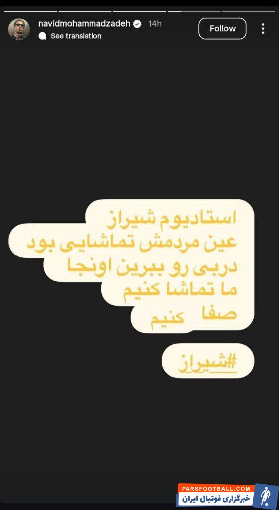 نوید محمدزاده ، بازیگر سینما و تلویزیون در خصوص دربی پایتخت و برگزاری آن در شیراز یک استوری منتشر کرد و نوشت.