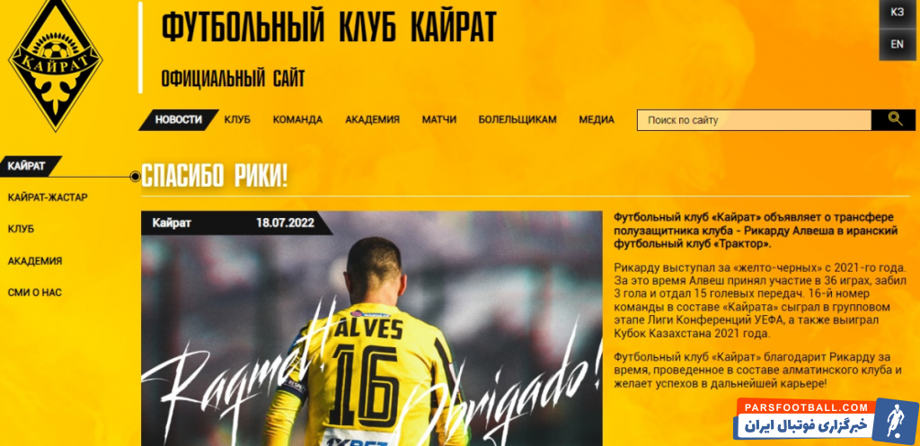 باشگاه غیرت قزاقستان از انتقال هافبک این باشگاه، ریکاردو آلوز به باشگاه تراکتور ایران خبر داد.